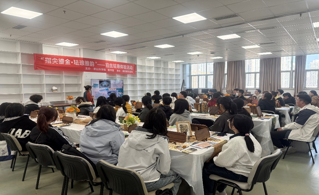、图书馆联合主办,唐臣美育基地承办的“指尖鎏金·珐琅雅韵”掐丝珐琅体验活动顺利举行。活动以“触摸非遗温度、沉浸式感受传统工艺魅力”为核心,聚焦文化视野拓宽与文化自信培育,通知一经发布便引发全校学子热烈反响——线上报名突破300人,最终遴选65名学生参与现场体验,火爆氛围充分彰显了非遗文化在青年学子中的强大感染力。