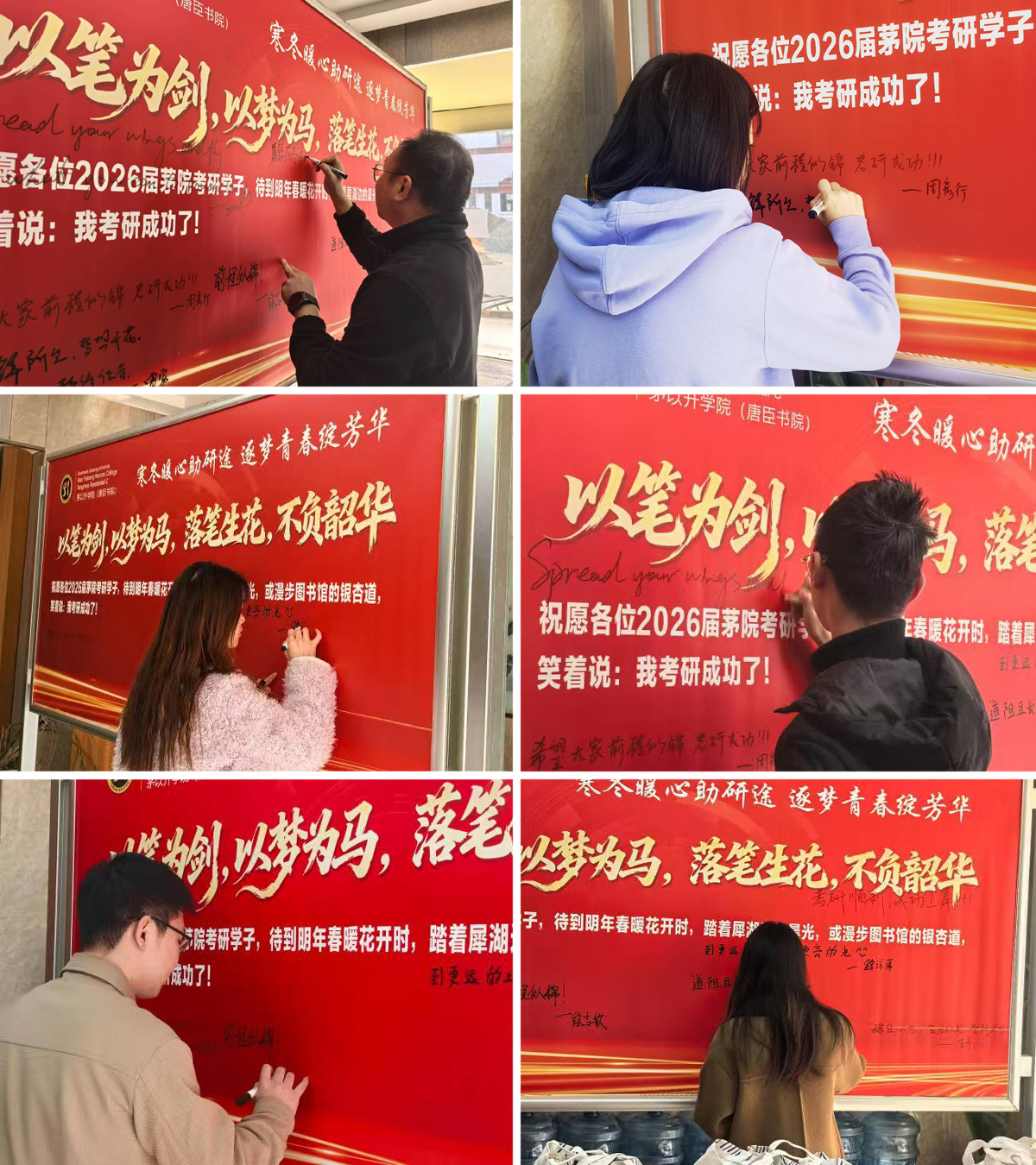 现场,一面印着以笔为剑,以梦为马,落笔生花,不负韶华的红色主题寄语墙格外醒目,成为整场活动的暖心亮点。学院老师们与同学们纷纷驻足,在寄语墙上挥笔写下真挚的祝福与期许,为冲刺考研的学子们凝聚起同心奋进的精神力量。杨宏毅老师写下“愿你历尽千帆,得偿所愿,金榜题名!”的深切祝福;王丹老师留下“稳住心态,全力以赴,考研必胜!”的铿锵鼓励;雷雳老师笔下的“愿笔锋所至,梦想开花,考研加油,静待佳音!”的字迹温暖真挚;路萍萍老师亦提笔写下“到更远的地方,见更亮的光!”的美好期许。一句句暖心寄语、一行行真挚祝福,让学子们在文字的暖意中汲取奋进力量,更加坚定了冲刺研考的决心。